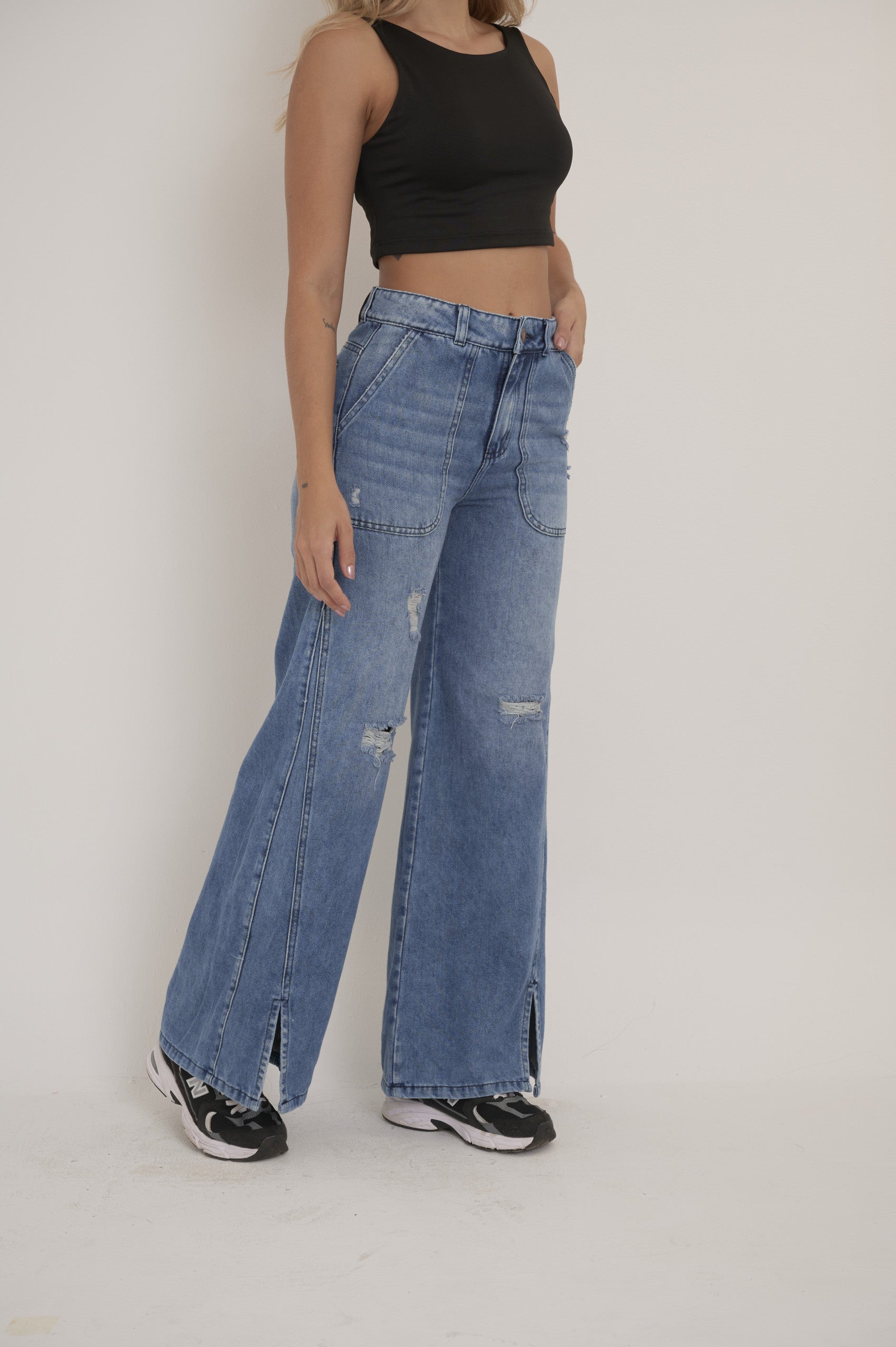 Jean rígido tipo palazo, tiro alto color azul indigo , tela 100% algodón , La modelo mide 1.75 cm usa talla 6