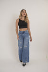Jean rígido tipo palazo, tiro alto  color  azul indigo , tela 100% algodón , La modelo mide 1.75 cm   usa talla 6