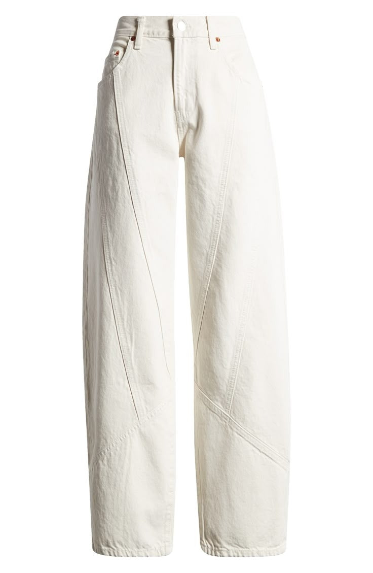 Jean rígido tipo palazo, tiro alto  color  blanco crudo tela 100% algodón , La modelo mide 1.75 cm   usa talla 6